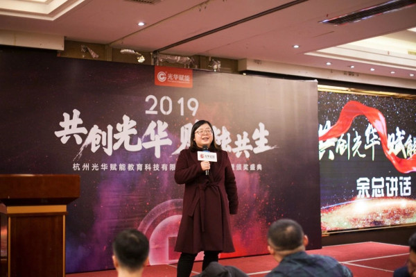 隨后,光華賦能總經理余彥娟女士上臺致新年賀詞,給全體員工打氣,鼓舞大家再接再厲,行動是最好的突破方式,新的一年不要給自己設置天花板,要突破再創新的輝煌。