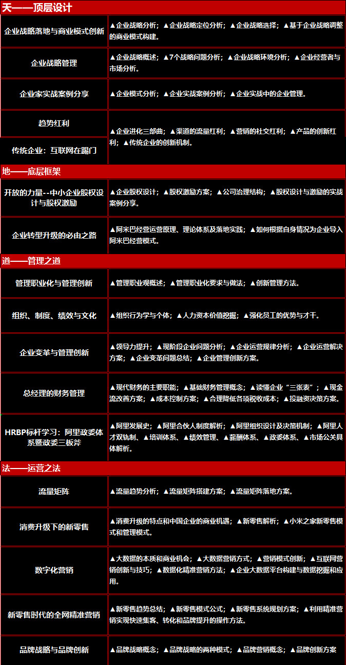 瞬息萬變成為新常態,企業家的思維、視野、能力、資源等對于企業的生存與發展尤為重要!很多的企業家們上了各種特訓營、總裁班,學了各類經營管理大道理,但知道的不少,會的不多!戰略不懂、股權不會、管理不得要領、運營沒有章法,如何做好一個企業,已成一門專業!
