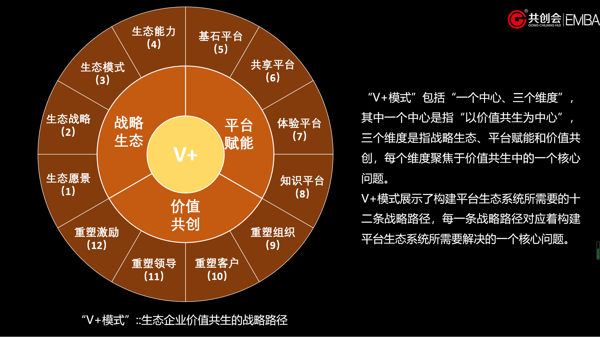 “V+模式”包括“一個(gè)中心、三個(gè)維度”,其中一個(gè)中心是指“以價(jià)值共生為中心”,三個(gè)維度是指戰(zhàn)略生態(tài)、平臺賦能和價(jià)值共創(chuàng),每個(gè)維度聚焦于價(jià)值共生中的一個(gè)核心問題。其中,“戰(zhàn)略生態(tài)”回答的問題是:創(chuàng)造什么價(jià)值?“平臺賦能”回答的問題是:能不能創(chuàng)造價(jià)值?價(jià)值共創(chuàng)回答的問題是:如何創(chuàng)造價(jià)值?