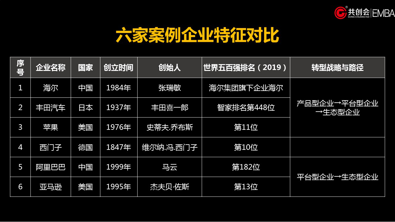 經過數據分析對比,我們發現這六家世界級企業的轉型方向高度一致。在第四次管理革命時代,它們都毫不猶豫地向平臺生態企業轉型,它們的戰略目標是構建“生生不息的生態系統”。