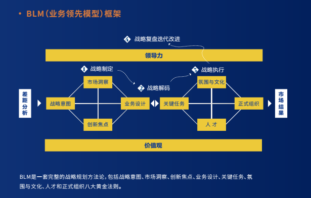 BLM是一套完整的戰略規劃方法論,包括戰略意圖、市場洞察、創新焦點、業務設計、關鍵任務、氛圍與文化、人才和正式組織八大黃金法則。