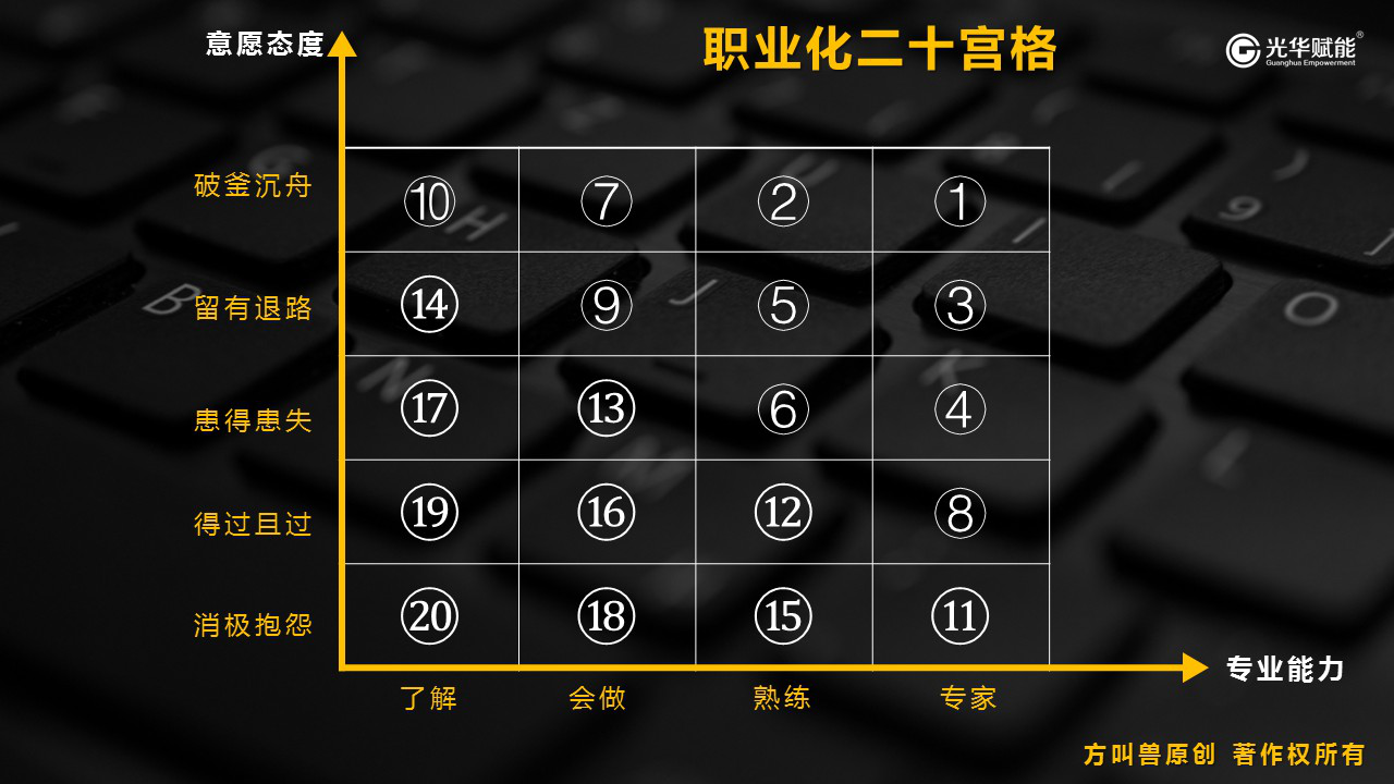 這里再來提提員工職業化的問題,我獨創了職業化二十宮格評價模型。人可以根據這個宮格進行職業化的定位。很多企業中員工職業化程度很低,因為企業管理者,企業的人力資源體系沒有給員工清晰明確的職業化指引。