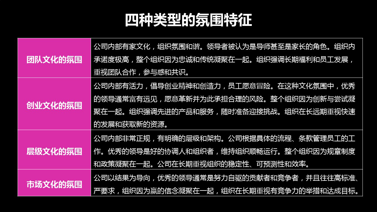 每個(gè)企業(yè)的文化都有一定的傾向性,有的公司的文化可能更傾向于團(tuán)隊(duì)文化的氛圍,有的公司可能更注重市場(chǎng)文化的氛圍。