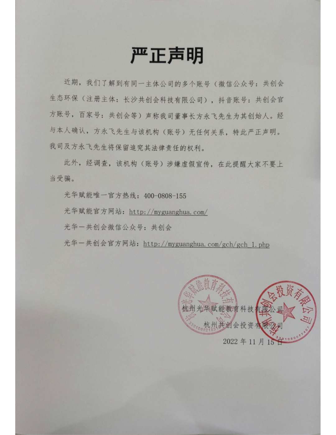 近期,我們了解到有同一主體公司的多個賬號(微信公眾號:共創會生態環保(注冊主體:長沙共創會科技有限公司),抖音賬號:共創會官方賬號,百家號:共創會等)聲稱我司董事長方永飛先生為其創始人。經與本人確認,方永飛先生與該機構(賬號)無任何關系,特此嚴正聲明。我司及方永飛先生將保留追究其法律責任的權利。