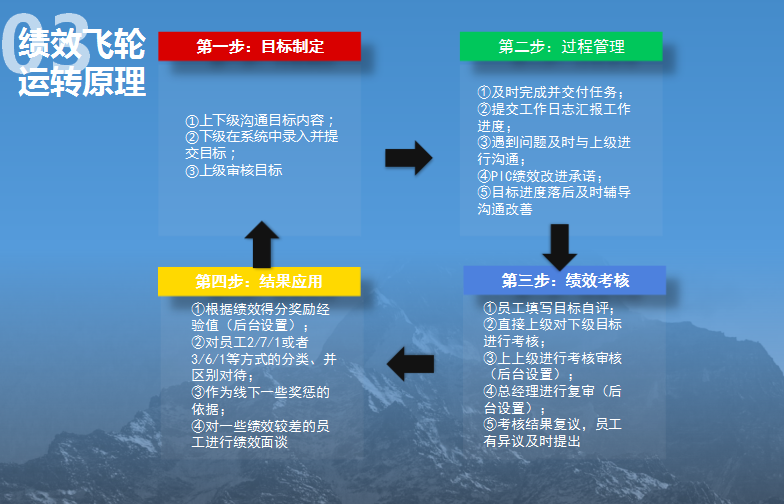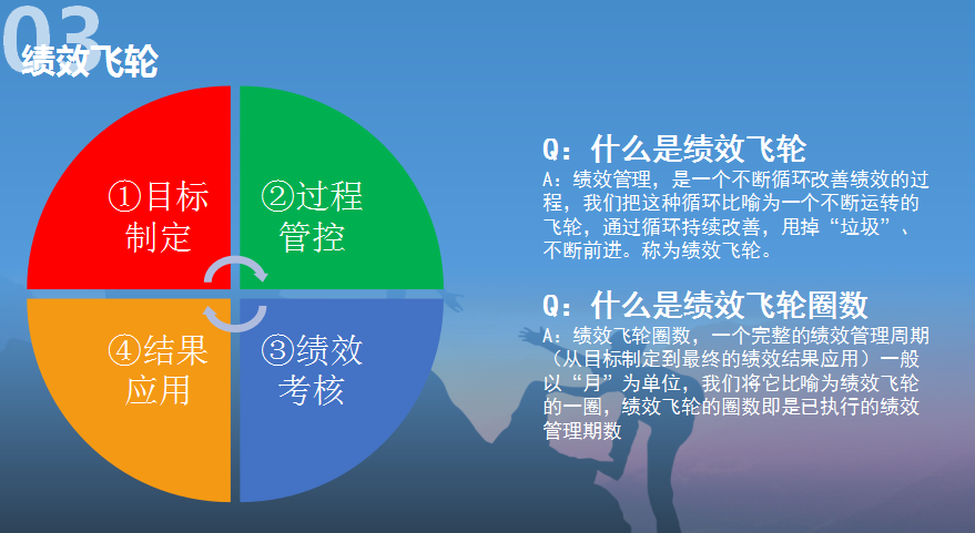 A:績效管理,是一個不斷循環改善績效的過程,我們把這種循環比喻為一個不斷運轉的飛輪,通過循環持續改善,甩掉“垃圾”、不斷前進。稱為績效飛輪。