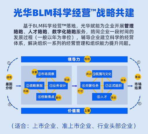 基于BLM科學經營落地,光華賦能為企業開展管理陪跑、人才陪跑、數字化陪跑服務,陪同企業一段時間的發展過程(一般以年為單位),輔導企業建立科學的經營體系,解決組織一系列的經營管理和組織能力提升問題。