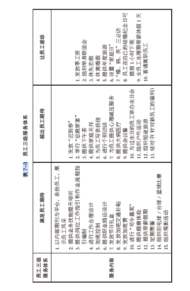 搭建海底撈用戶三級(jí)服務(wù)體系的具體動(dòng)作列成表格,企業(yè)和中層在搭建員工三級(jí) 服務(wù)體系時(shí)仍然可以沿用這一方法。表 7-3 即是常用的一些做法(表中有些做法是中層職權(quán)范圍之外的,中層需要根據(jù)自己的職權(quán)范圍和主管部門的實(shí)際情況有選擇地實(shí)施)。
