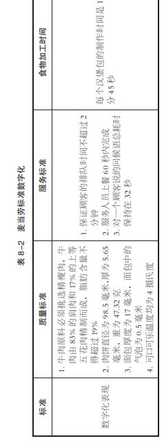 麥當(dāng)勞的管理標(biāo)準(zhǔn)體系包括選址標(biāo)準(zhǔn)、店面裝修標(biāo)準(zhǔn)(全球統(tǒng)一)、衛(wèi)生標(biāo)準(zhǔn)、工作程序標(biāo)準(zhǔn)、質(zhì)量標(biāo)準(zhǔn)(全球統(tǒng)一)、服務(wù)標(biāo)準(zhǔn)等。 其中,衛(wèi)生標(biāo)準(zhǔn)、工作程序標(biāo)準(zhǔn)被拆解為若干個(gè)具體的操作動(dòng)作(如表8-1),質(zhì)量標(biāo)準(zhǔn)、服務(wù)標(biāo)準(zhǔn)、食物加工時(shí)間更是全部實(shí)現(xiàn)了數(shù)字化(如表 8-2)。